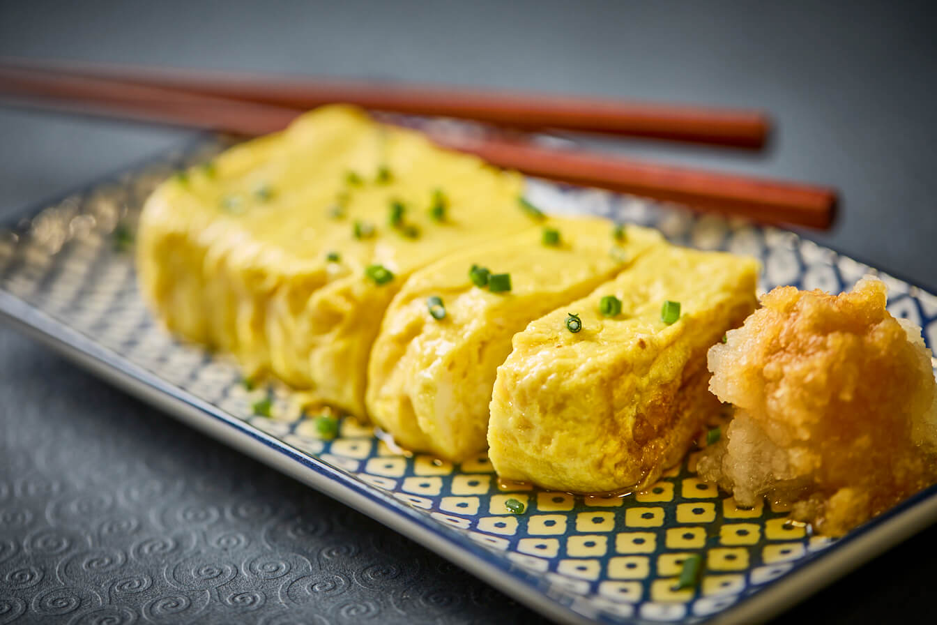 Tamagoyaki is a rolled and seasoned japanese omelette, renowned for its fluffy texture and delicate flavor. This specialty, also known as dashimaki tamago when enriched with dashi broth, can be enjoyed as thick slices in a bento or as thin portions atop sushi.