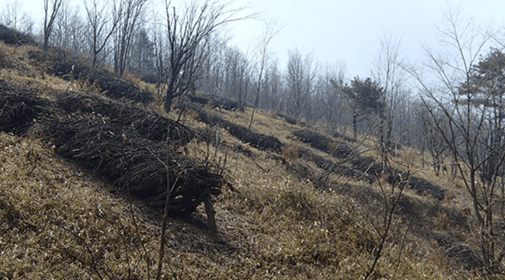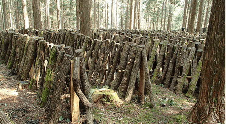 Chaque année, au mois de novembre, les agriculteurs procèdent à l’abattage de chênes japonais de 12 à 15 ans. Ces derniers sont alors laissés à même le sol pendant 2 mois. Ils seront ensuite débités en morceaux de 125 cm et ensemencés de mycélium de shiitaké. Pour ce faire, 20 trous sont pratiqués dans le tronc avec une mèche. Enfin, les troncs ensemencés sont allongés les uns sur les autres, de façon linéaire, sur quelques rangées, puis recouverts de feuilles et de branchages. Ils resteront ainsi abandonnés pendant 2 longues années, période indispensable au bon développement du mycélium.