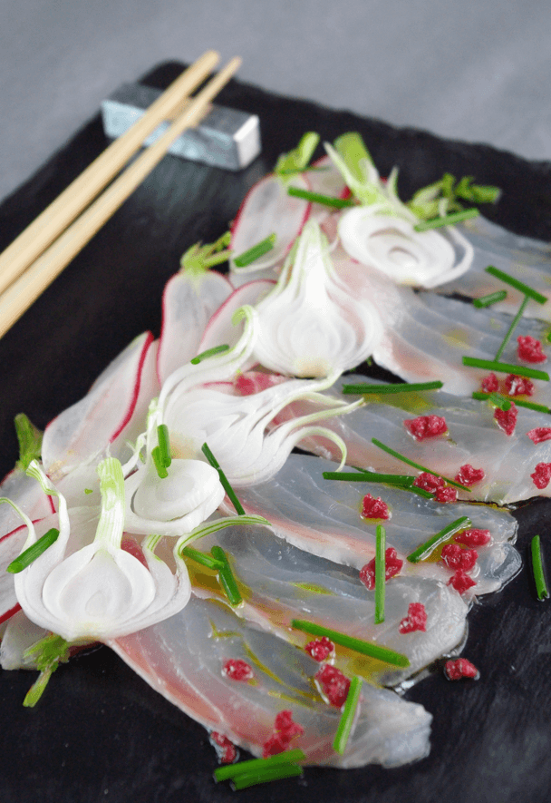 6. Poser les morceaux de dorade et les légumes sur l’assiette. Arroser avec le vinaigre et l’huile végétale. Parsemer d’Uméboshi séché.