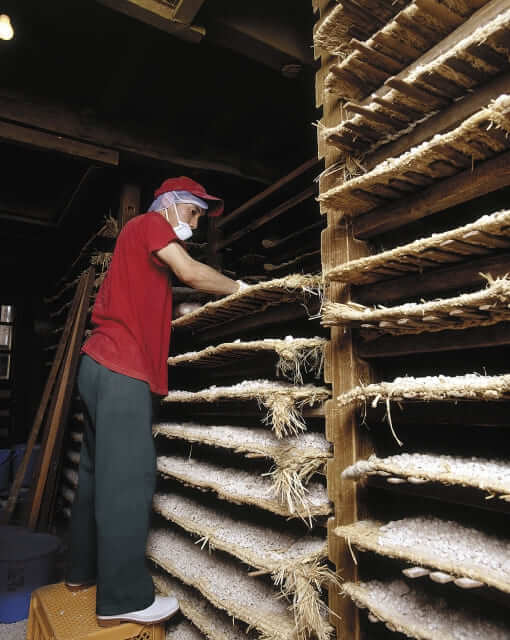 La fabrication du mushiro kôji continue pendant 3 jours et 3 nuits, sans interruption. Au bout de 6 heures, après avoir été étalés sur les nattes mushiro, les ingrédients sont fermes, preuve que le levain agit.