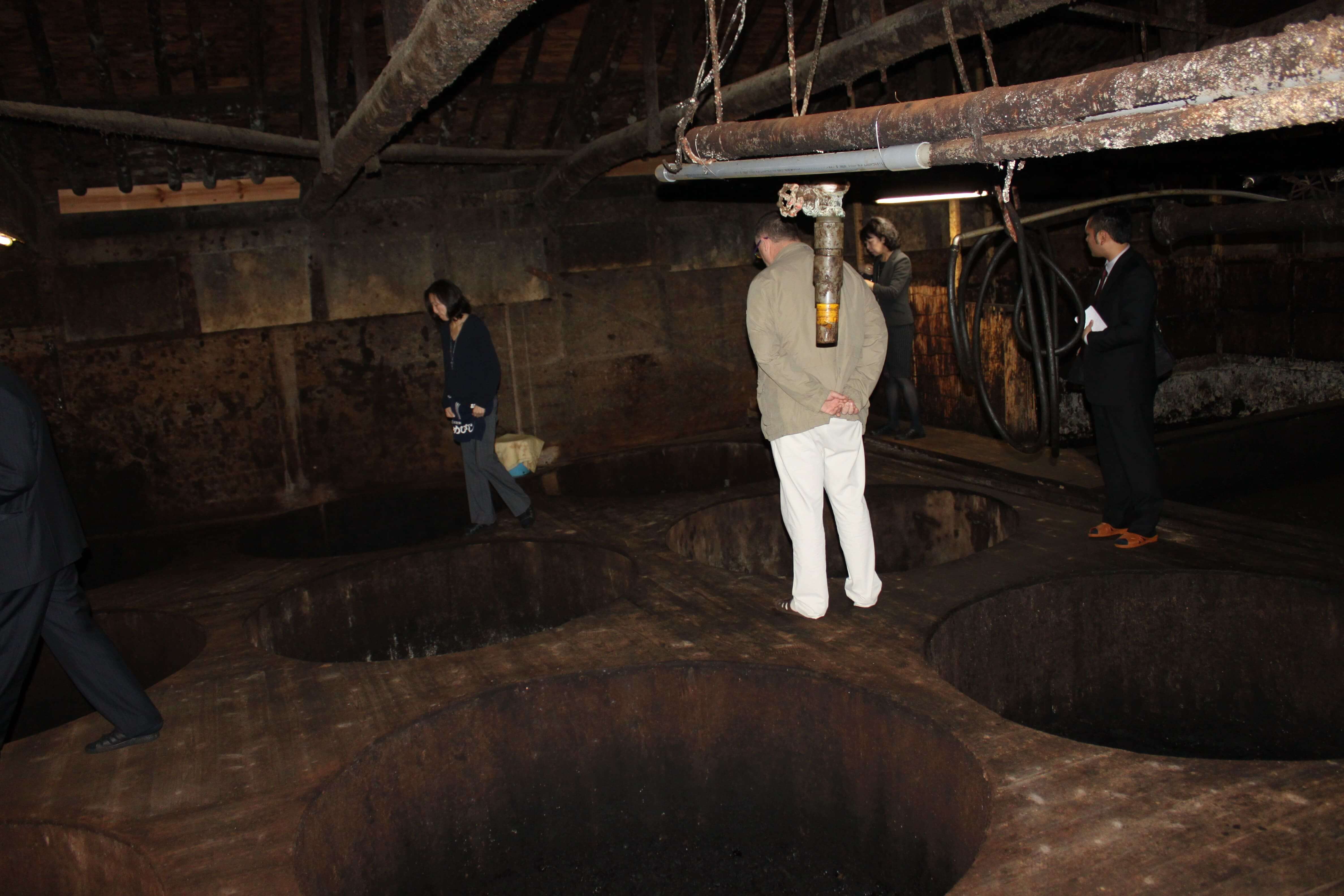 Aux premières heures du quatrième jour, le kôji change progressivement de couleur et libère tous ses arômes. Il est prêt ! On y ajoute alors de l’eau salée et le mélange, appelé moromi, est placé dans de grands fûts en cèdres. Les cuves en cèdre, où est stocké le moromi, existent depuis plus de 200 ans.