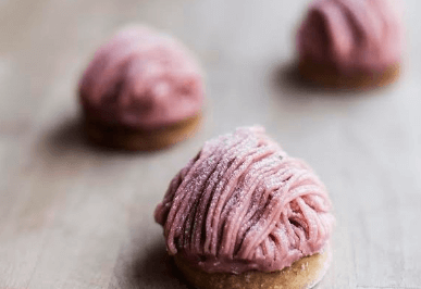 A l’aide d’un appareil conçu à cet effet, recouvrez de « vermicelles » en pâte de haricot blanc à la feuille de cerisier. Terminez en saupoudrant de neige décor.
