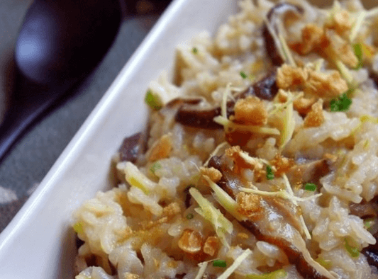 5. Servir le risotto dans les assiettes et garnir de gingembre haché, de ciboulette émincée et d’éclats de croustillants de soja.