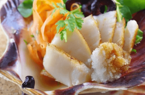 La sauce yuzu ponzu est une sauce typique dans la cuisine japonaise à base d’agrumes acides, de sucre, d’algues et de bonites séchées. Sachiyo Harada l’accommode ici avec des Saint-Jacques.