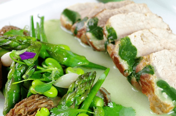 Préparation du veau grillé et les légumes de printemps, sauce Matcha