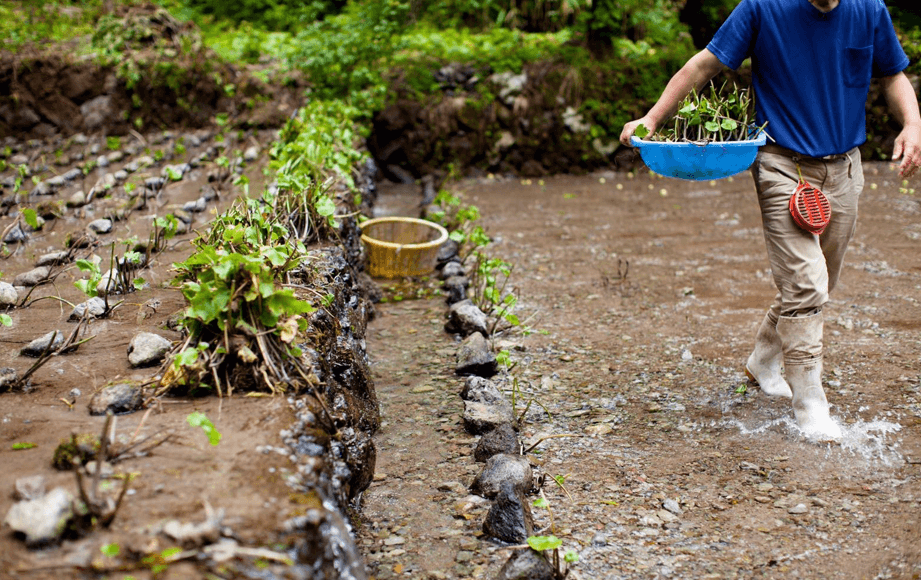 Voda je ne-apnenec in zelo mehka. Njegove terase so bogate z naravnimi hranilnimi snovmi. Po žetvi se pesek terase speremo z vodo, da odstranite blato in vazo. Očiščena terasa je ostala na teden pred novo kulturo.